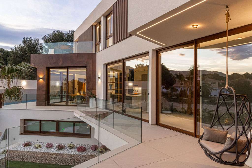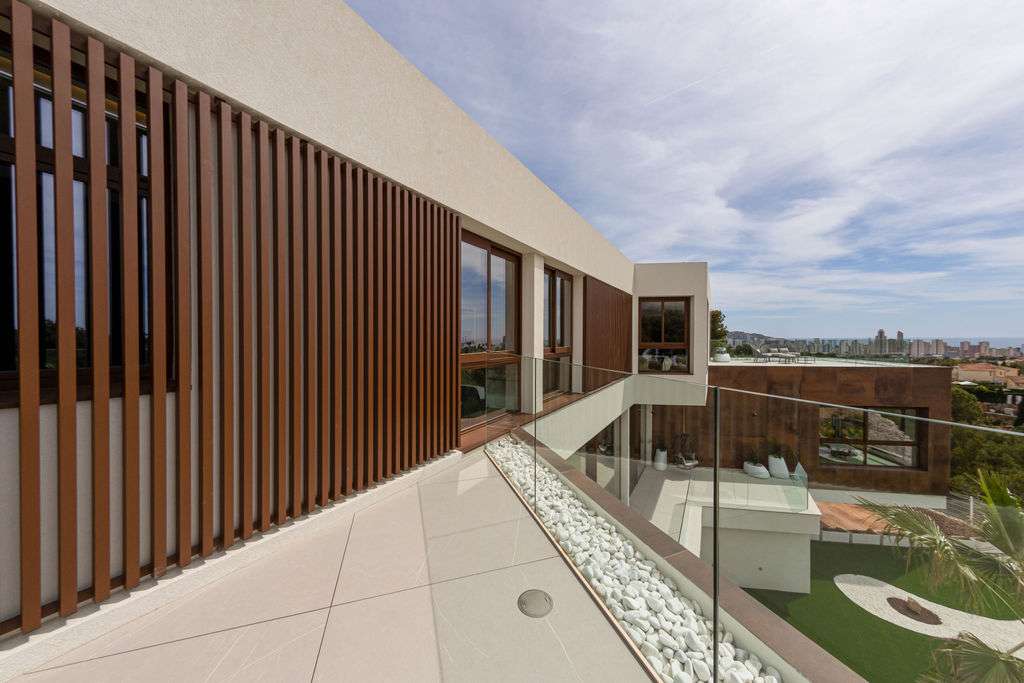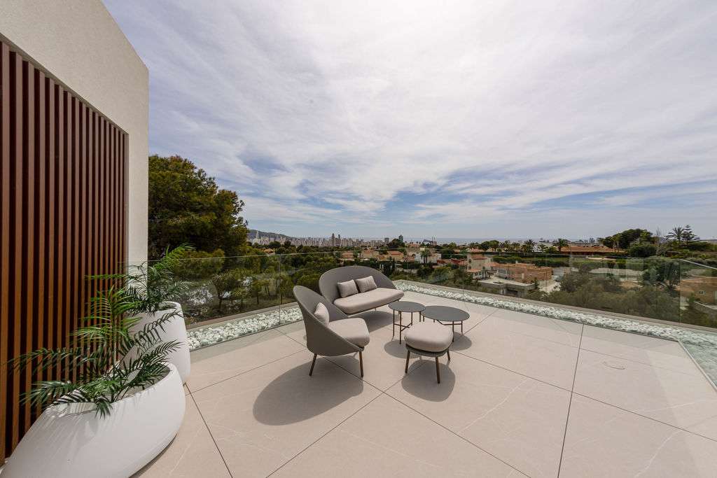 Esta impresionante villa contemporánea combina una arquitectura elegante, un diseño refinado y el máximo confort, todo ello ubicado en una de las zonas más exclusivas de Benidorm. Con impresionantes vistas al mar Mediterráneo y al icónico skyline de la ciudad, la propiedad está diseñada para ofrecer un estilo de vida excepcional. En la planta principal, la villa cuenta con una elegante cocina americana conectada a la perfección con un amplio salón con acceso directo a una terraza con vistas al mar. Esta planta también incluye un aseo de invitados, un despacho privado y un dormitorio, perfecto para invitados o familiares. Tanto las escaleras como el ascensor conectan todas las plantas de la casa para una máxima comodidad. La planta superior cuenta con tres dormitorios en suite, cada uno con su propio baño y acceso directo a terrazas con espectaculares vistas al mar y al skyline de Benidorm. En la planta baja, la villa ofrece un garaje privado con espacio para varios coches y puerta eléctrica, una bodega, un lavadero y zonas de servicio. Aquí también encontrará una lujosa zona de spa equipada con piscina cubierta, hammam, sauna, ducha y baño, diseñada para la relajación y el bienestar. Las zonas exteriores incluyen un jardín paisajístico, una piscina privada y una zona de barbacoa con cómodo acceso directo desde la cocina, lo que la convierte en el lugar ideal para recibir invitados y disfrutar de la vida mediterránea en su máxima expresión. Esta villa es una oportunidad única para adquirir una vivienda que combina diseño vanguardista, confort y vistas inolvidables en uno de los destinos más prestigiosos de la Costa Blanca.